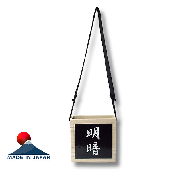 偈箱/げばこ 縦、横各21cm.厚み約7.5cm.ショルダーストラップ長さ約80cm(プラス10cmの調整可) 桐製、「明暗」のラミネーター貼付済み。外装に塗装無し 日本製